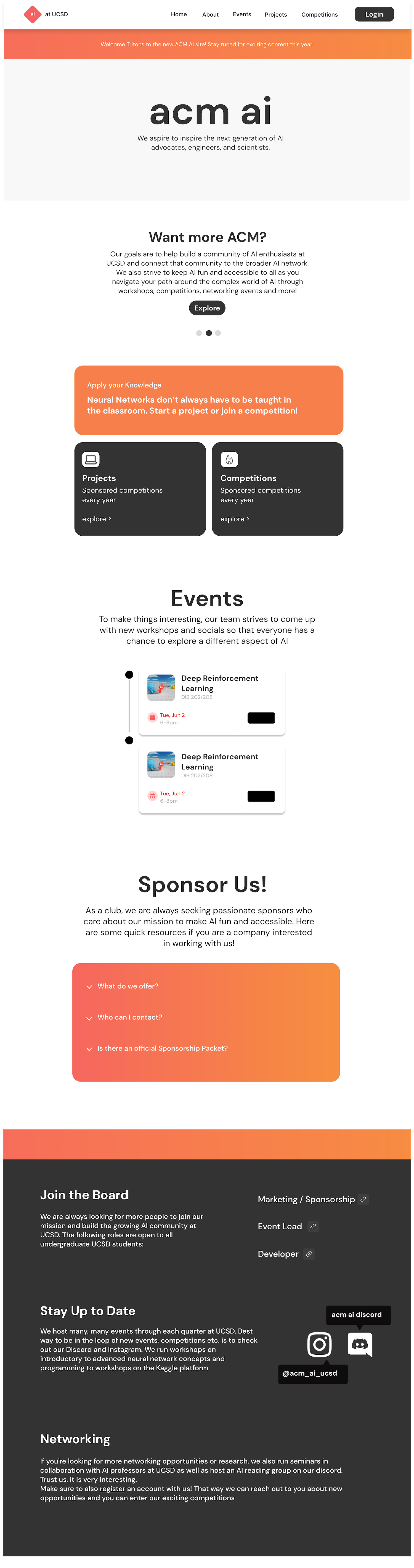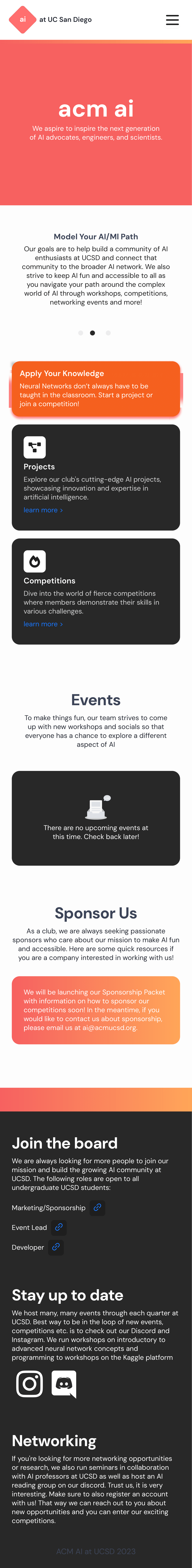 One of my first tasks as a frontend developer was to redesign the club's main website. I worked with another bright developer on our team over the last stretch of Summer 2024 trying out different ideas. The initial designs were...bare bones to say the least, but we were short on time and needed to push an MVP for the fall quarter. The third slide is the only photo I have of our first production version on a mobile browser.