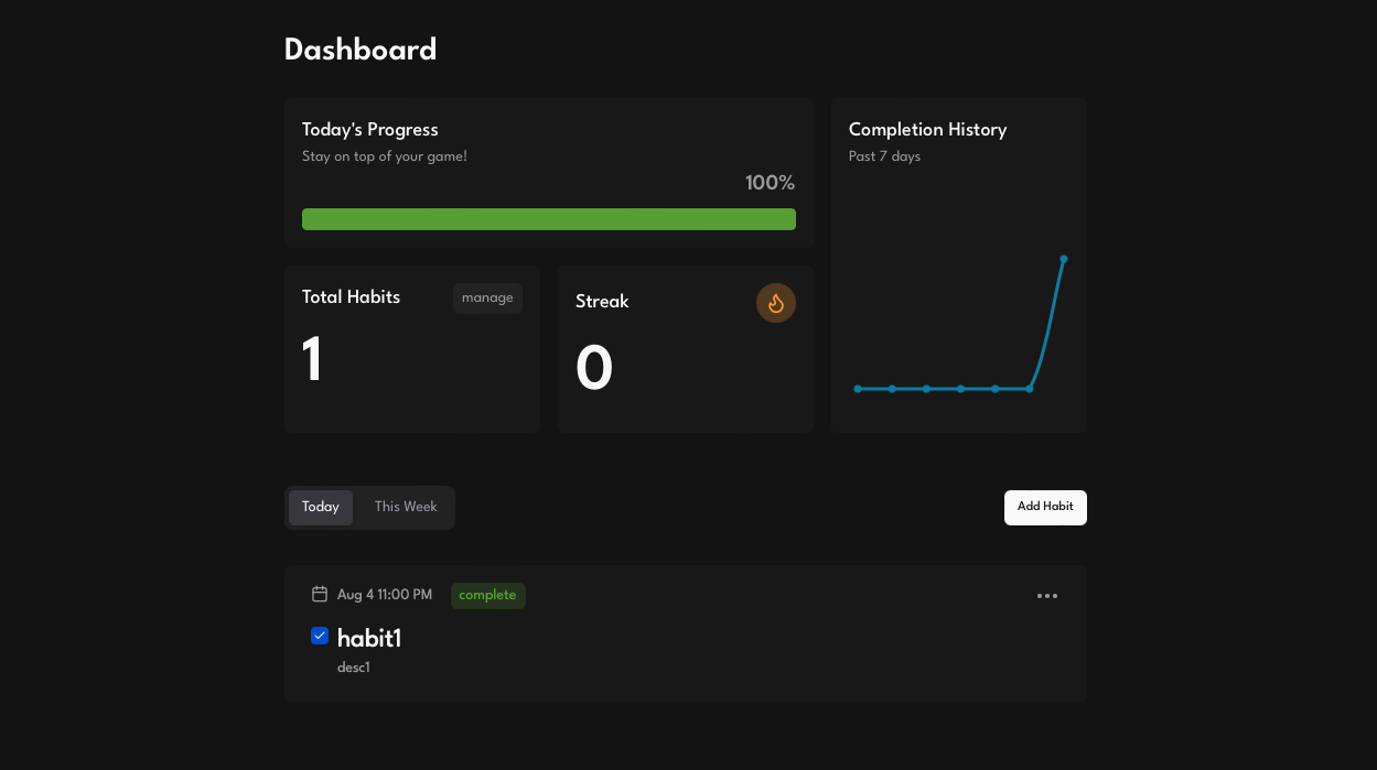 A Next.js web application that allows you to create and track your habits in a unified dashboard. Log in each day to complete your tasks and query information about your data using a conversational interface built on top of ChatGPT 4.1 Mini.